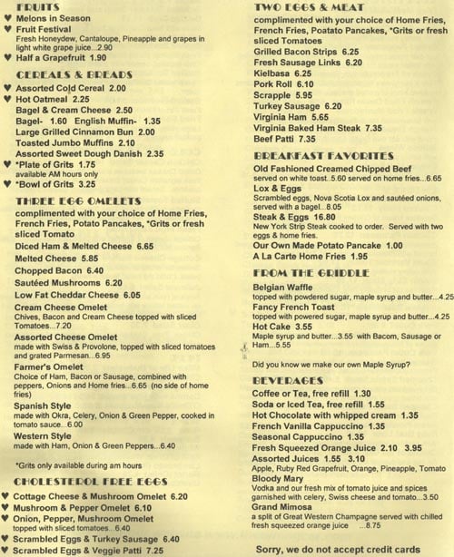 egg omelette with cream cheese, chives, and bacon, and topped with tomatoes. Served with home fries, french fries, or potato pancakes, and your choice of toast.